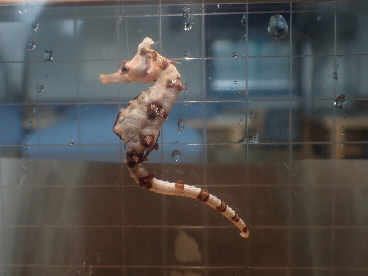 海藻の中に身を潜めているため、よく観察すると見つけることができます。父親がお腹の袋で子を育てる姿が特徴です。